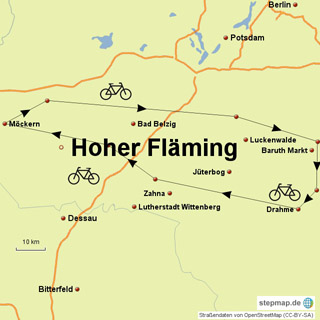 Wir starten in Möckern bei Magdeburg in Richtung Fläming. Schnell finden wir heraus, dass es sich beim Fläming um das letzte unentdeckte Hochgebirge Norddeutschlands handelt. Zumindest fühlen sich unsere Beine so an. Die Räder sind schwer beladen mit Isomatte, Schlafsack und Zelt sowie der ein oder anderen flüssigen Notration. Kreuz und quer geht es Richtung Osten durch den Naturpark Hoher